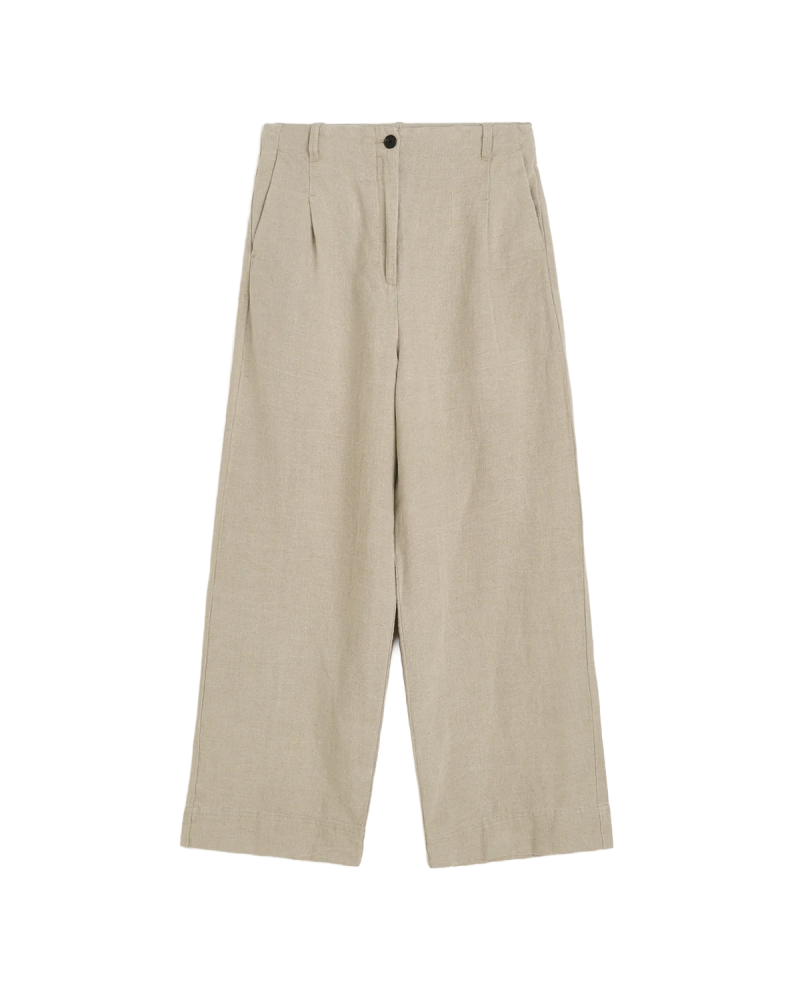 Et par tidløse bukser fremstillet i kraftig, uvasket hør, der giver et skulpturelt fald. Designet i en afslappet pasform med mellemhøj talje, vide ben, skrålommer, dybe læg, paspoleret baglomme og håndlavet hornknap.