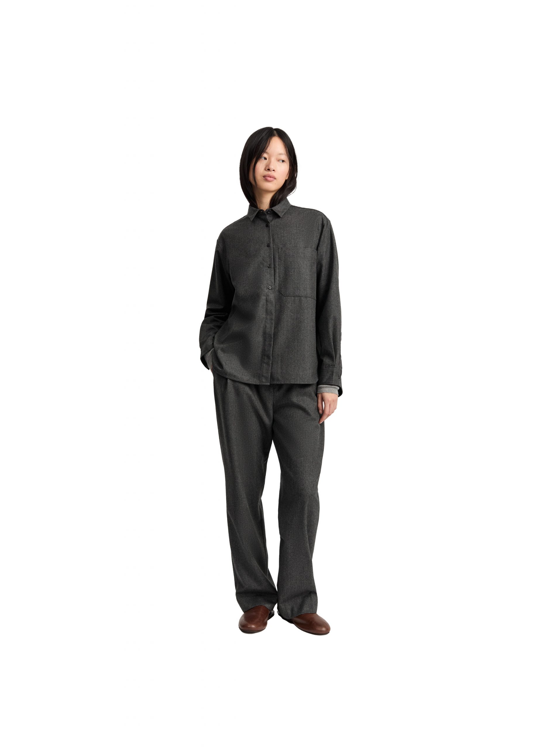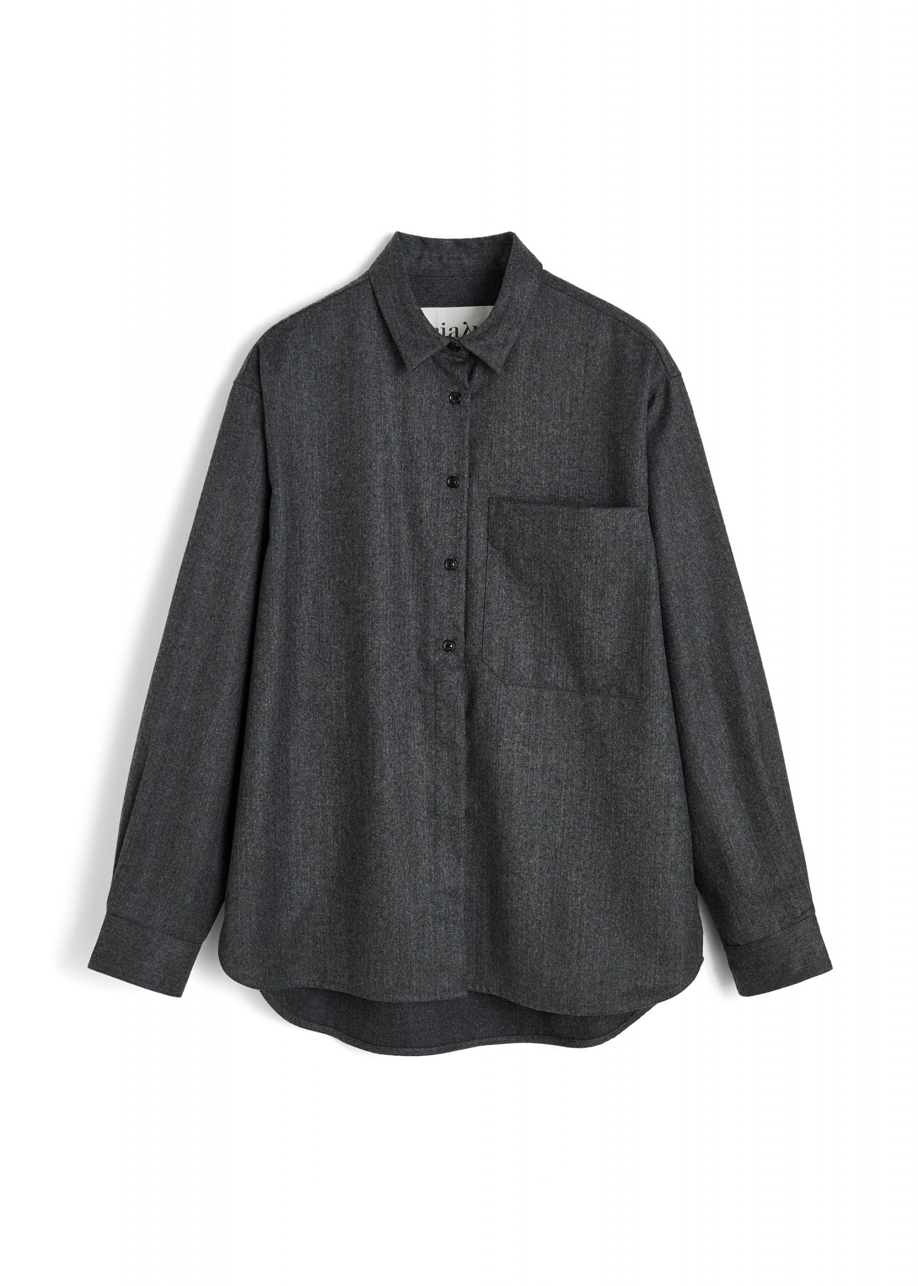 Lynette Shirt i glat uld fra danske AIAYU. Let oversize skjorte i fin børstet uld, skjulte knapper og en brystlomme. Skjorten er levet med let sænkede skuldre, for et elegant fald på kroppen.