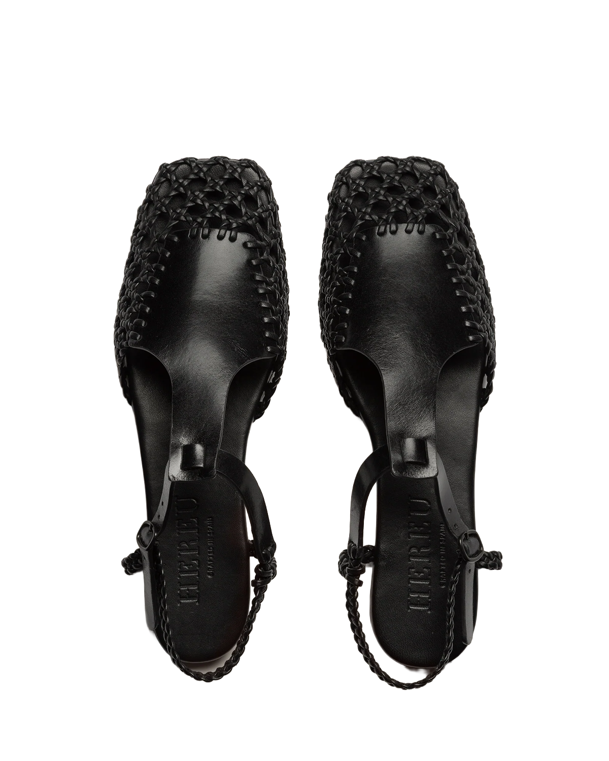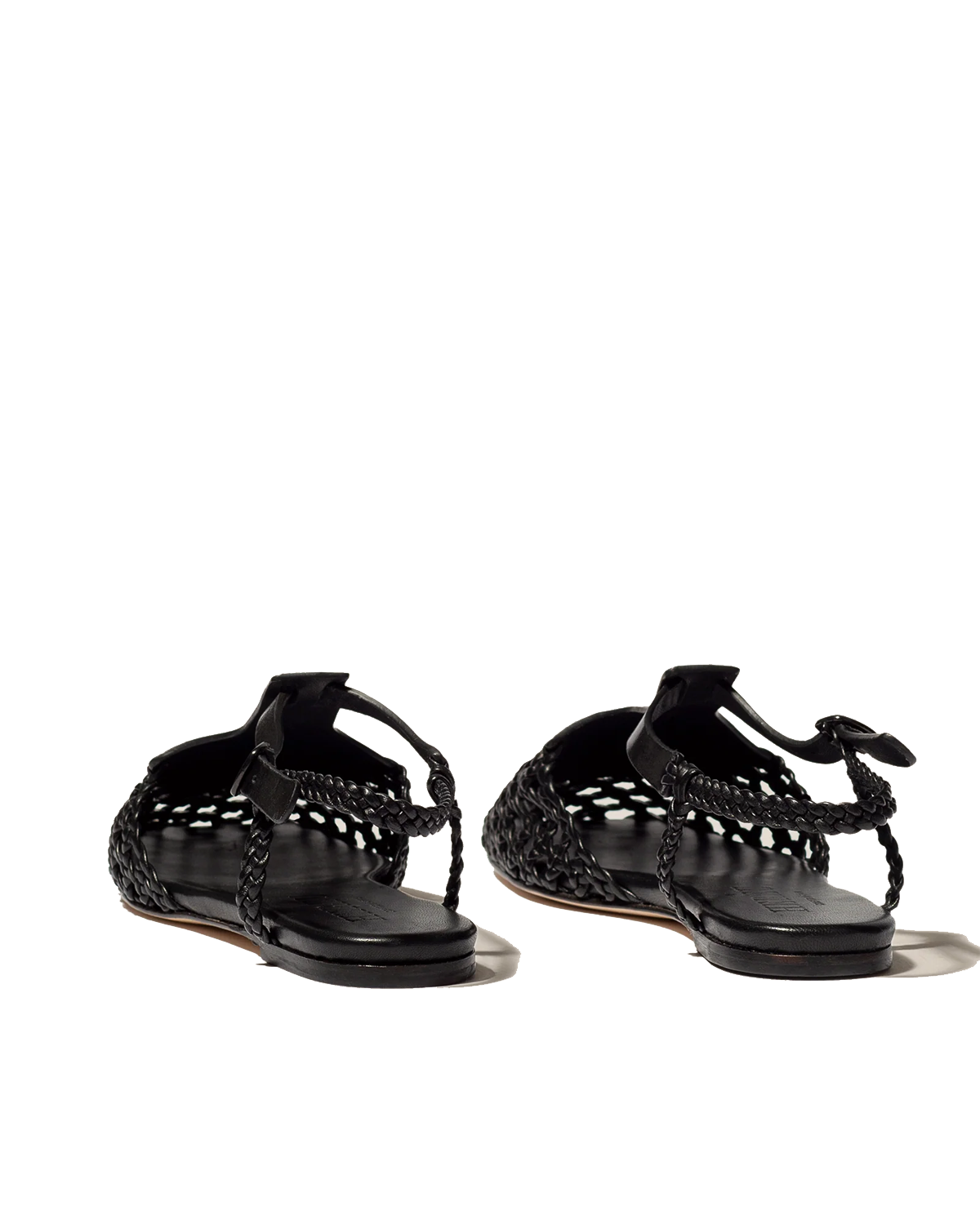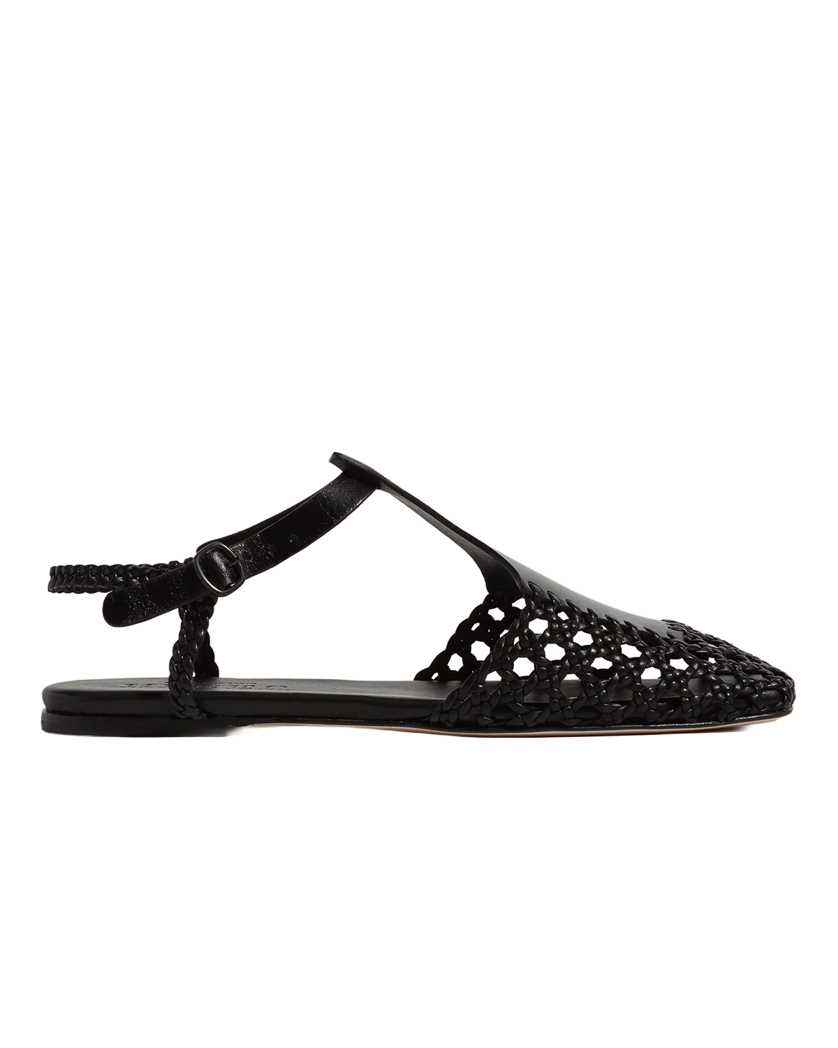 T-bar sandal med firkantet snude og håndvævet overdel, fremstillet i en kombination af vegetabilsk garvet kalveskind og blødt lammeskind.