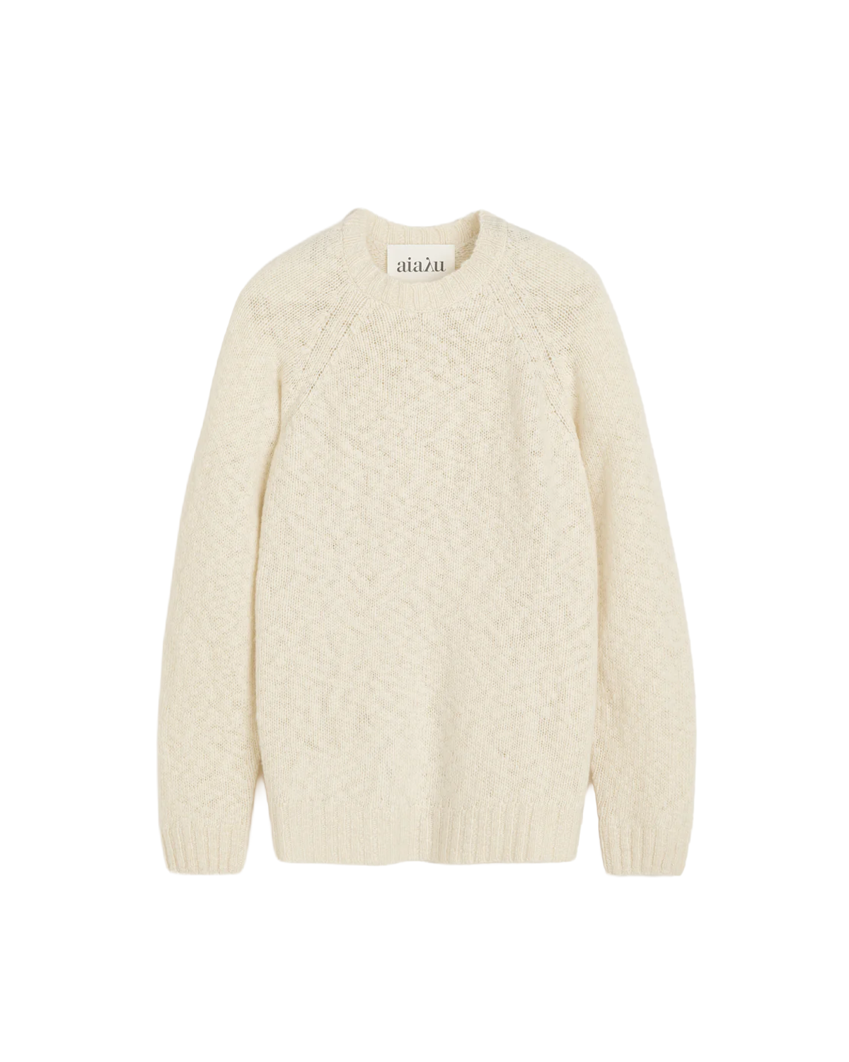 En blød sweater strikket i uld af slub-garn, som giver en struktureret og let transparent effekt. Strikken er designet i en afslappet pasform med raglanærmer og afsluttende ribkanter.