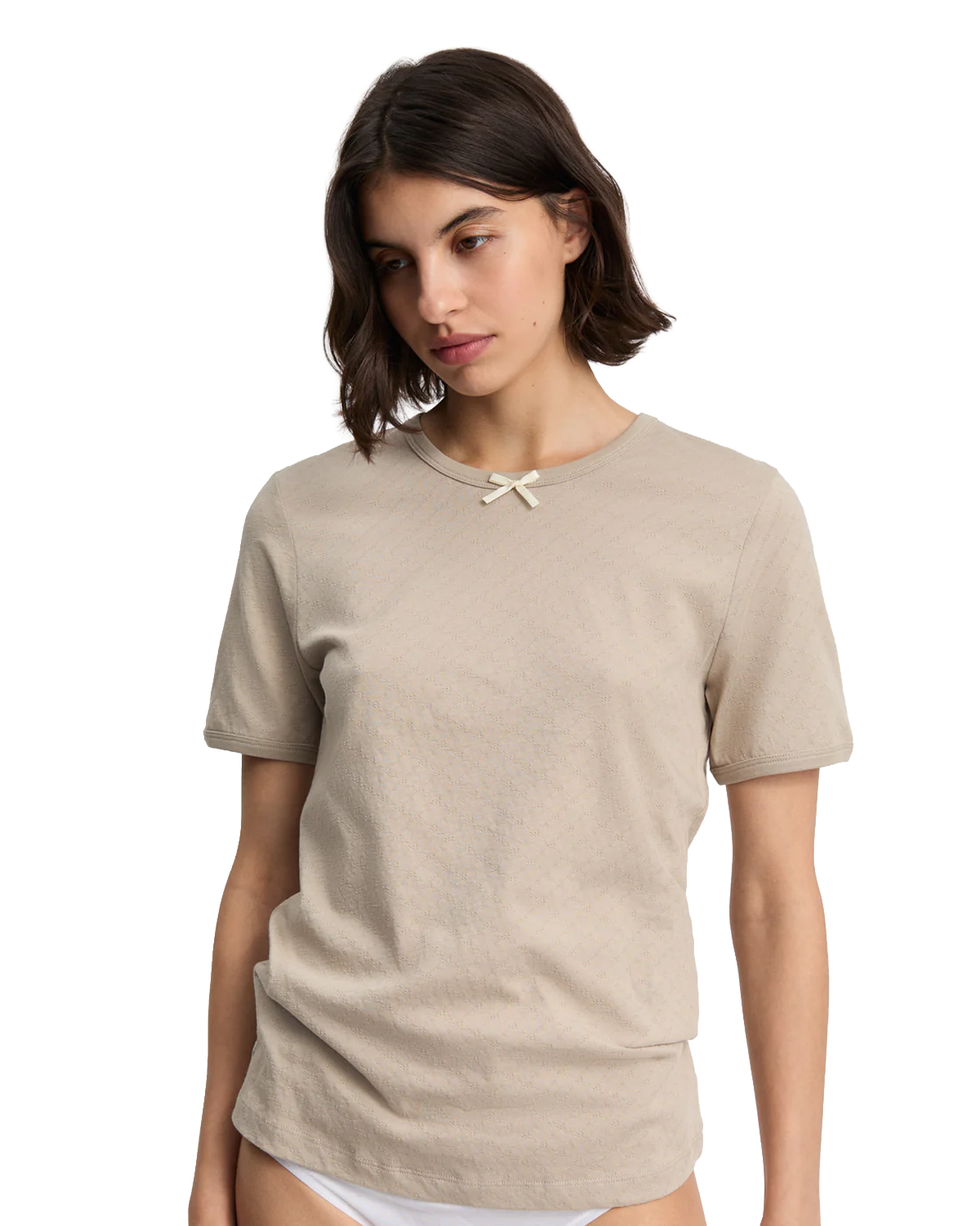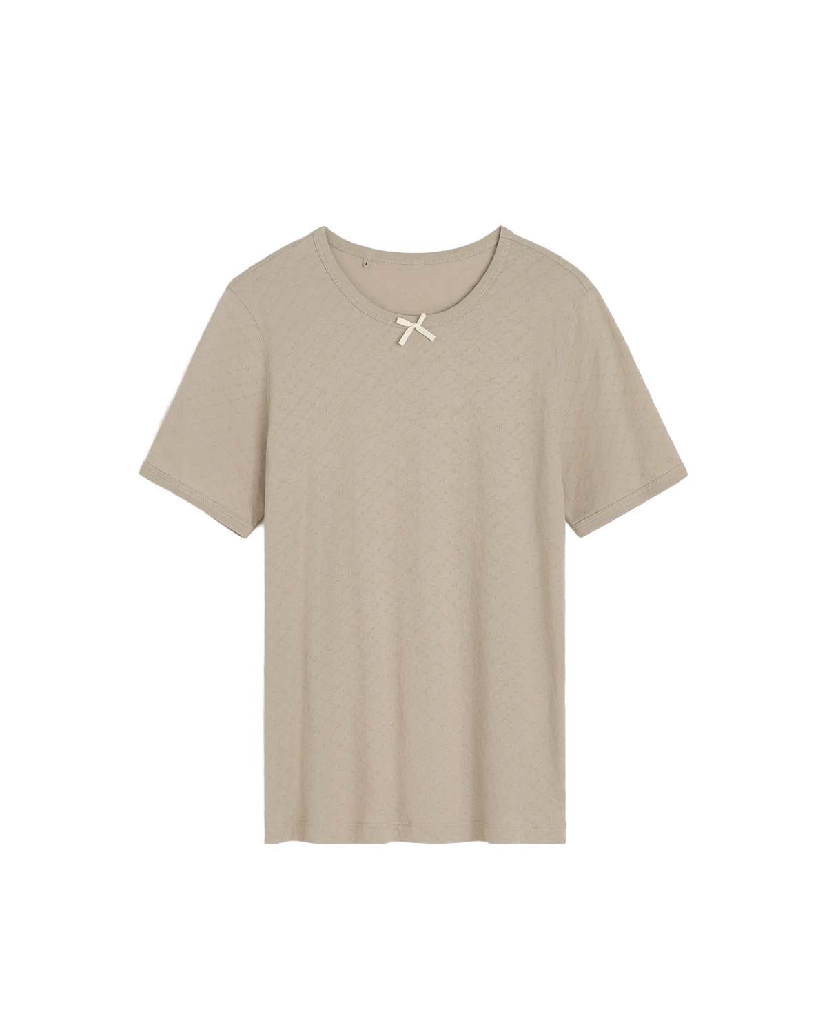 En klassisk t-shirt i en let, pointelle-inspireret mesh jersey, som giver et fint og detaljeret udtryk. Modellen er designet med en dekorativ sløjfe midt foran samt ribkanter ved hals og ærmer. Den tætsiddende pasform fremhæver en elegant og feminin silhuet.