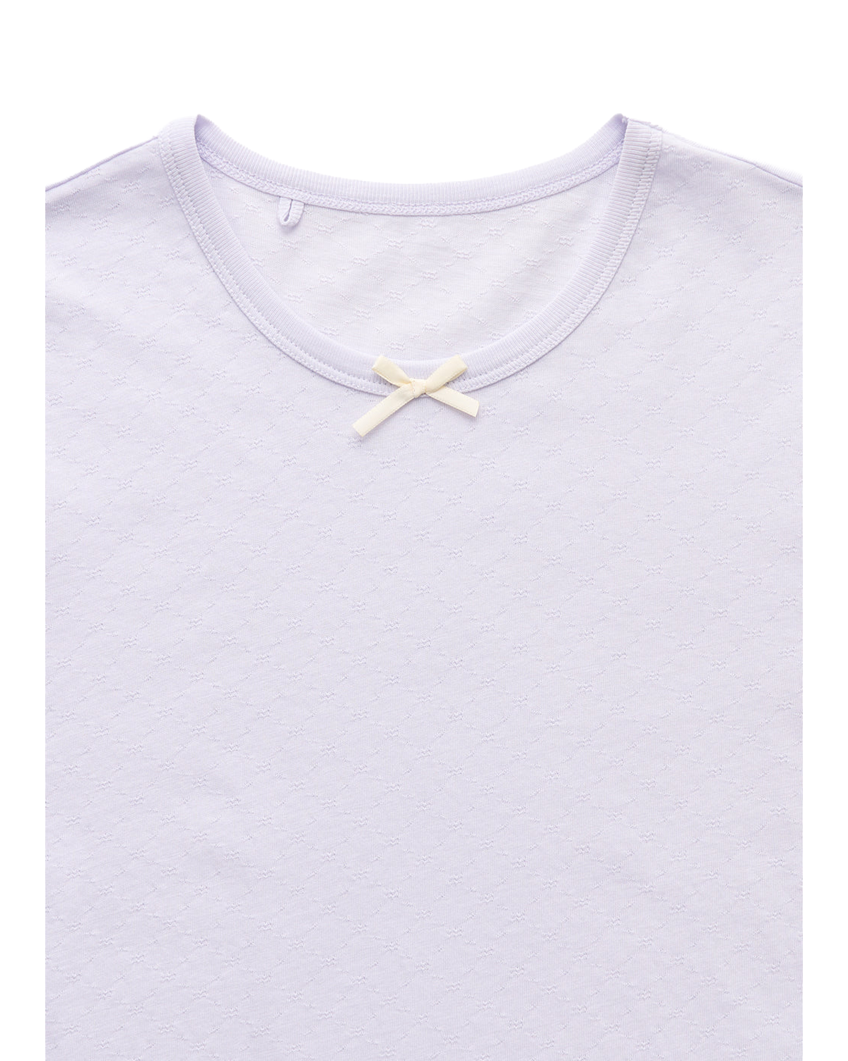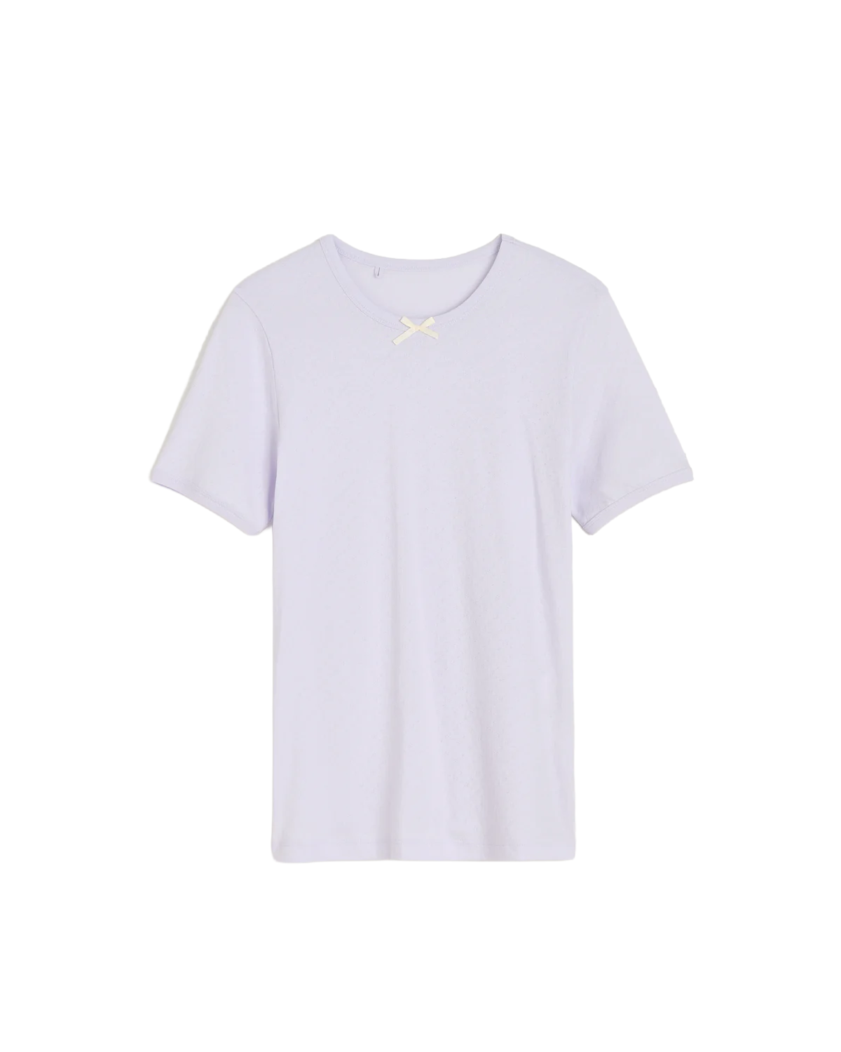 En klassisk t-shirt i en let, pointelle-inspireret mesh jersey, som giver et fint og detaljeret udtryk. Modellen er designet med en dekorativ sløjfe midt foran samt ribkanter ved hals og ærmer. Den tætsiddende pasform fremhæver en elegant og feminin silhuet.
