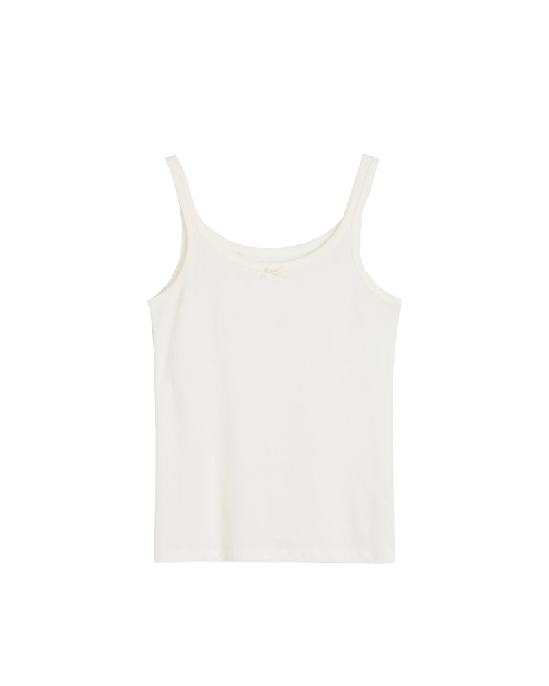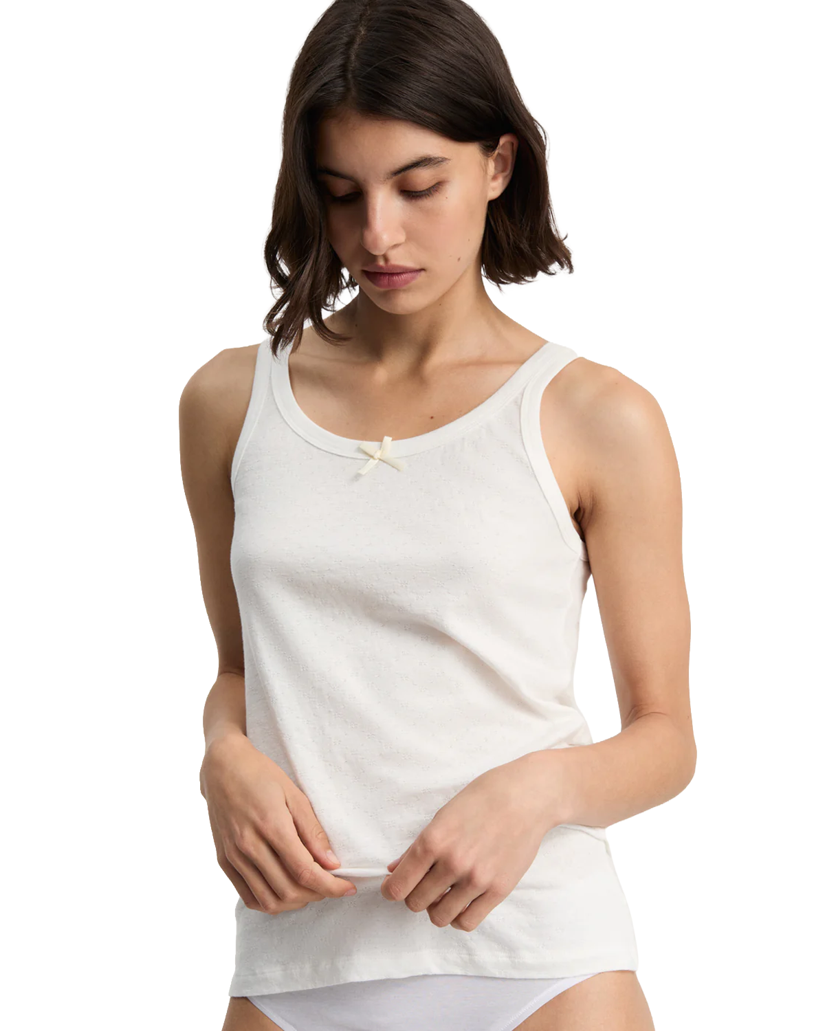 En klassisk tanktop i en let, pointelle-inspireret mesh jersey, som tilfører et fint og detaljeret udtryk. Modellen har en dekorativ sløjfe midt foran samt ribkanter ved hals og skuldre. Det lige snit giver en elegant og feminin silhuet.