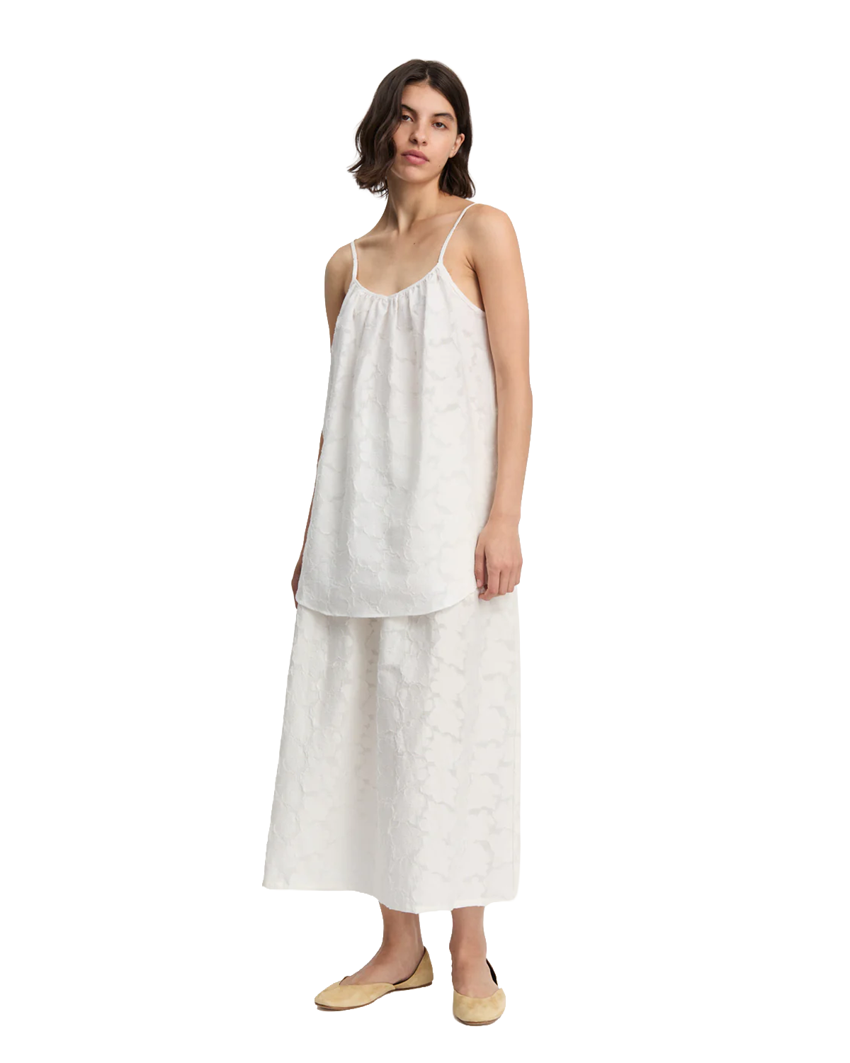 En feminin stroptop fremstillet i økologisk bæk-og-bølge-bomuld med et skulpturelt fald. Toppen er designet med en elegant rynkedetalje, der skaber smuk volumen, samt en diskret V-hals, bindebånd foran, justerbare skulderstropper og en afrundet kant.