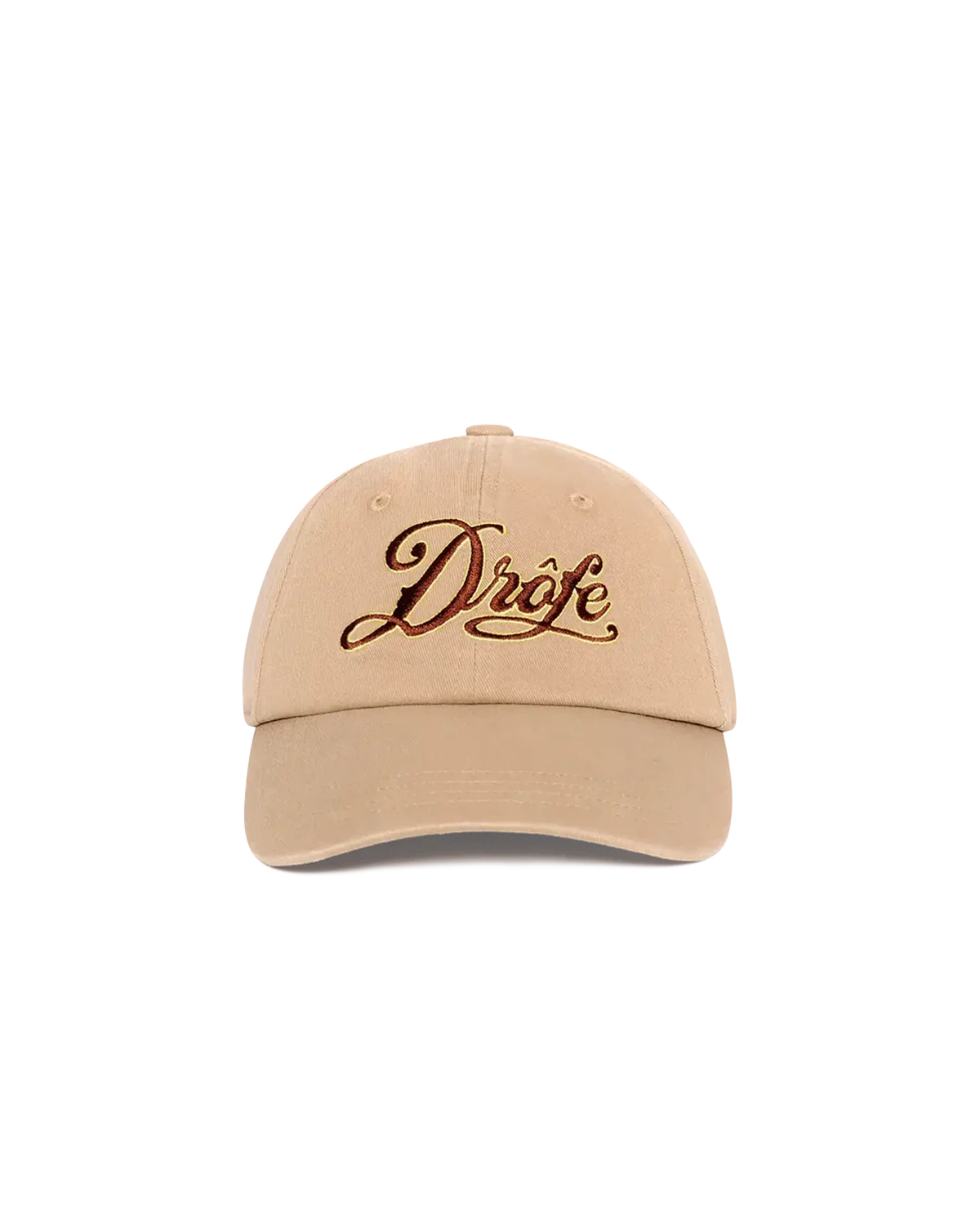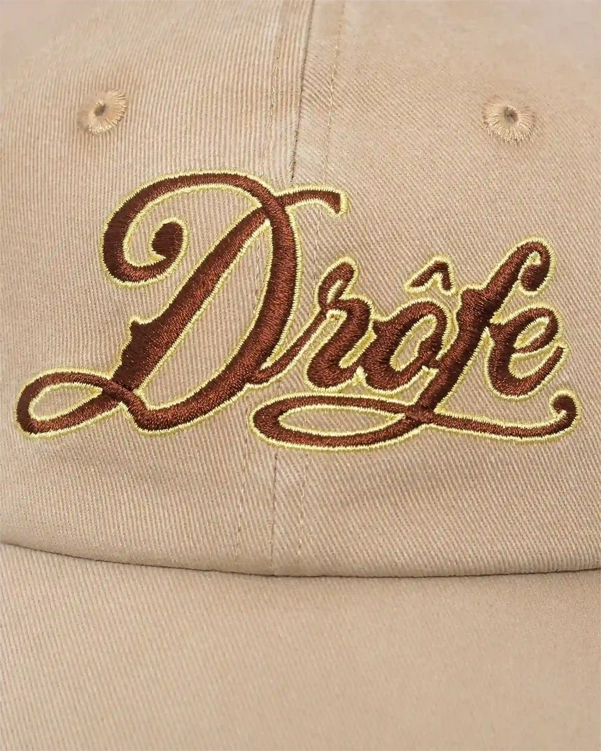 Beige cap med seks paneler har en buet skygge og et broderet “Drôle” motiv foran. Bagpå er der en påsyet “Drôle” label samt en justerbar rem med metals spænde, så pasformen nemt kan tilpasses.