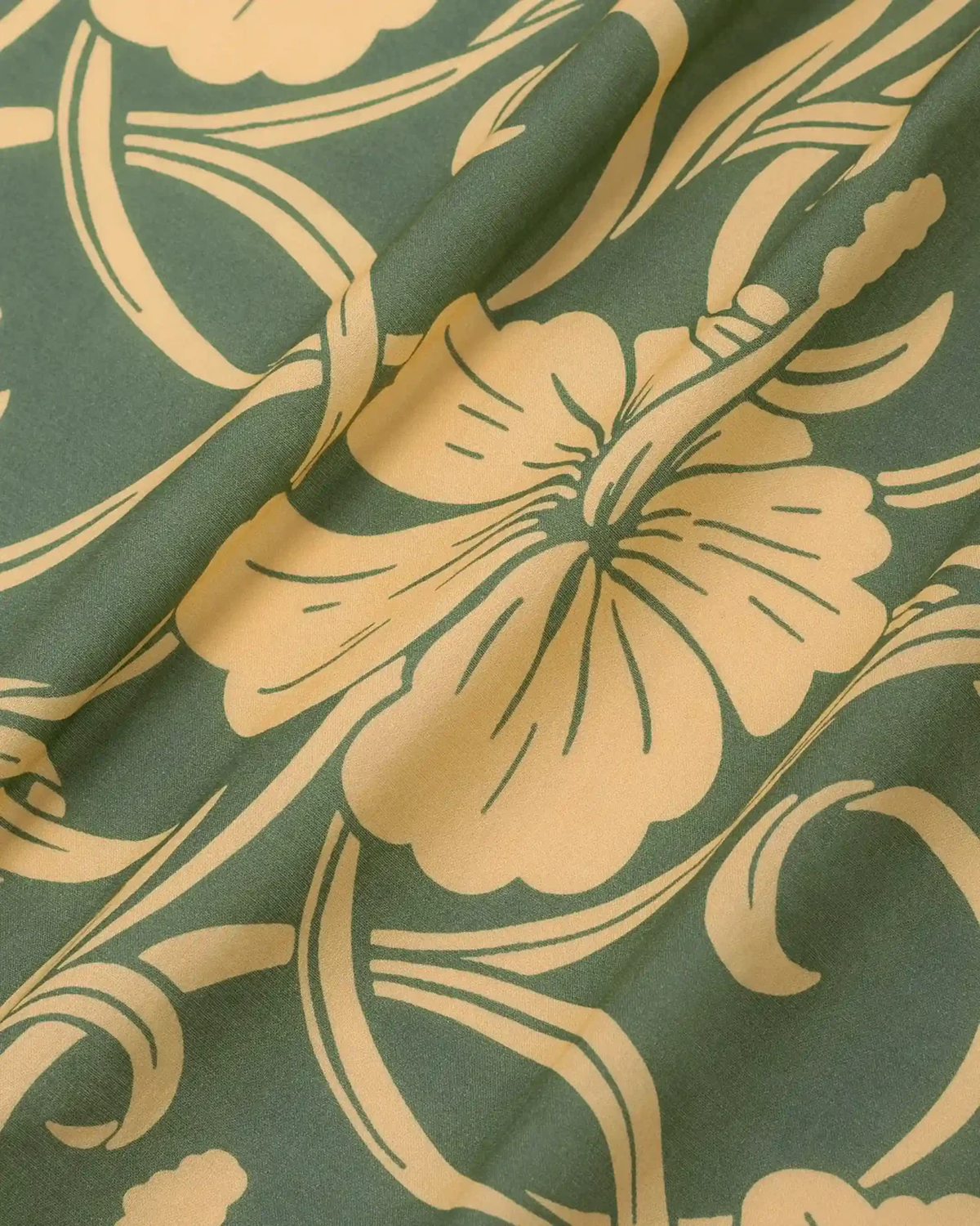Denne grønne, kortærmede skjorte i 100 % bomuld er dekoreret med et gennemgående hibiscus-print. Den har en åben krave, en løs pasform og lukkes med fem graverede knapper foran.